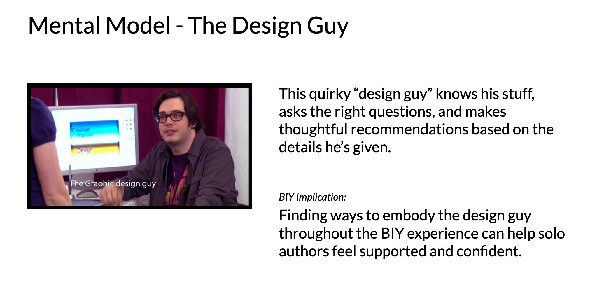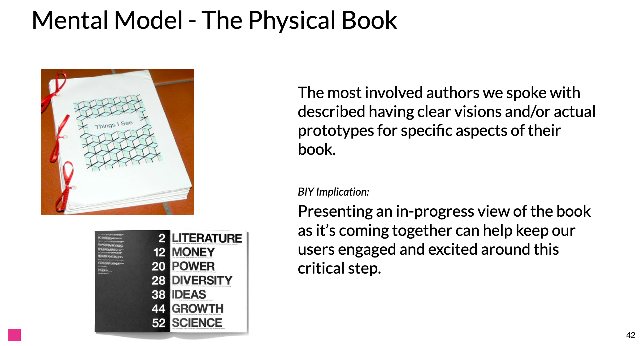 We also reviewed their working audience personas, and explored how each of these types of users might use a new book design tool differently.